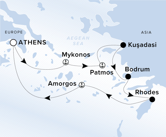 A map of the Aegean Sea and Greek Isles. A line starting in Athens going to Mykonos, Patmos, Kusadasi, Bodrum, Rhodes, Amorgos and ending in Athens.