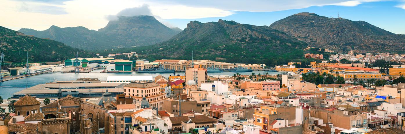 An aerial view of orange viewed buildings and green mountains.