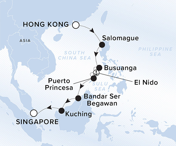 A map of the South China Sea, Sulu Sea, and Philippine Sea. A line shows the voyage route from Hong Kong, Salomague, Busuanga, El Nido, Puerto Princesa, Bandar Seri Begawan, Kuching and Singapore.