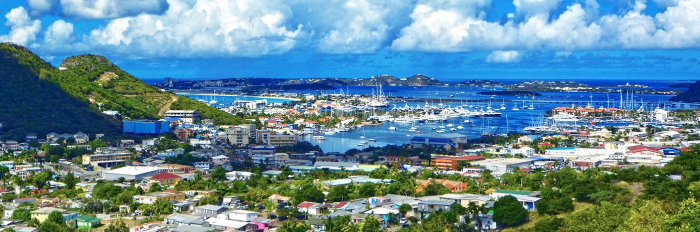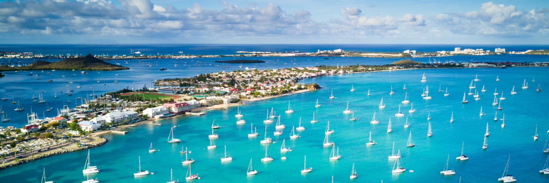 Sailboats dot the bright blue waters of the marina, surrounding the town on a small stretch of land.