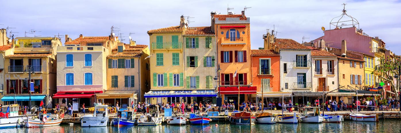 Colorful buildings and boats line a vibrant and bustling dockside.