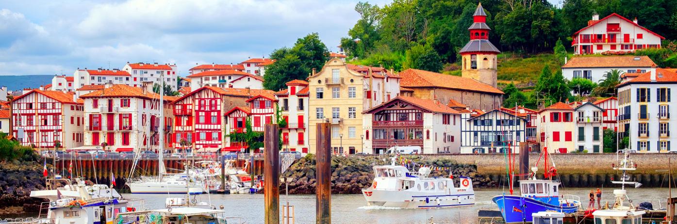Colorful homes with red shutters look out onto a boat filled harbor.