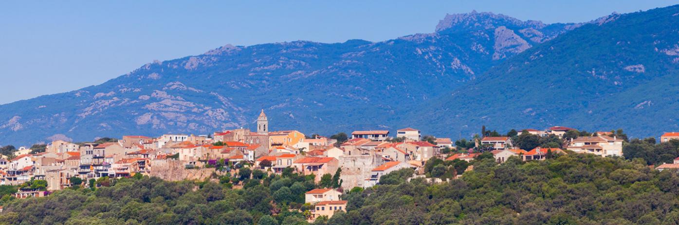 Orange roofs dot the foreground with large mountains of greenery behind.