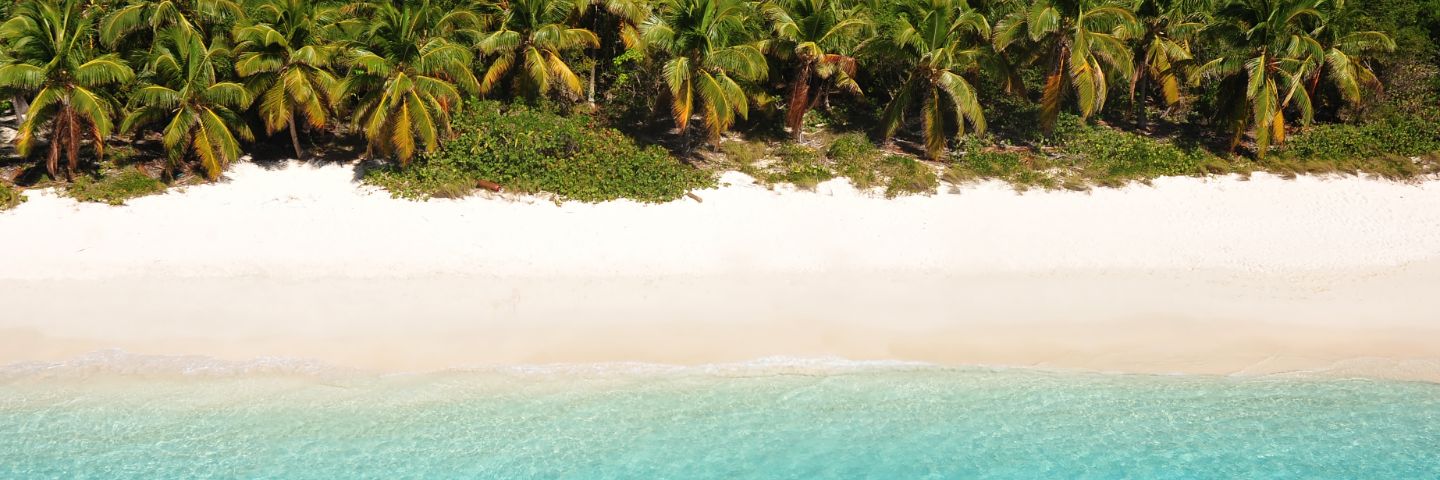 Lush vegetation leads to a white sandy beach, with gentle blue waves crashing ashore.