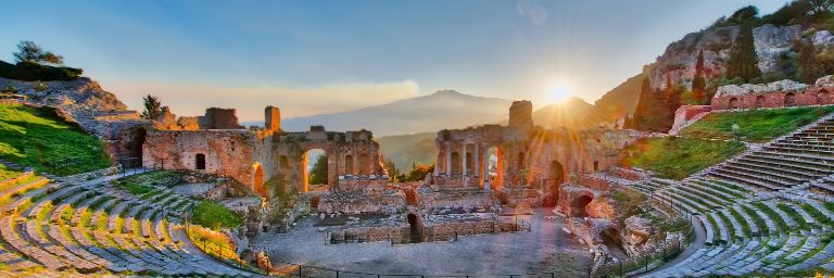 Sunbeams cascade across the Teatro Antico di Taormina ruins in Italy.