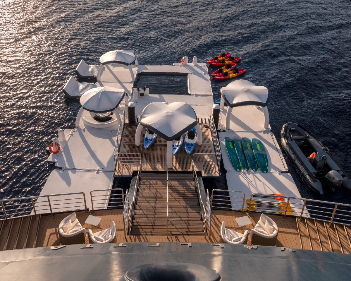 Sitting right at the water’s edge, the onboard Marina offers sun loungers and a generous choice of water toys. Like a private beach with seamless entry into the sea, it’s the go-to spot while at anchor in select destinations.