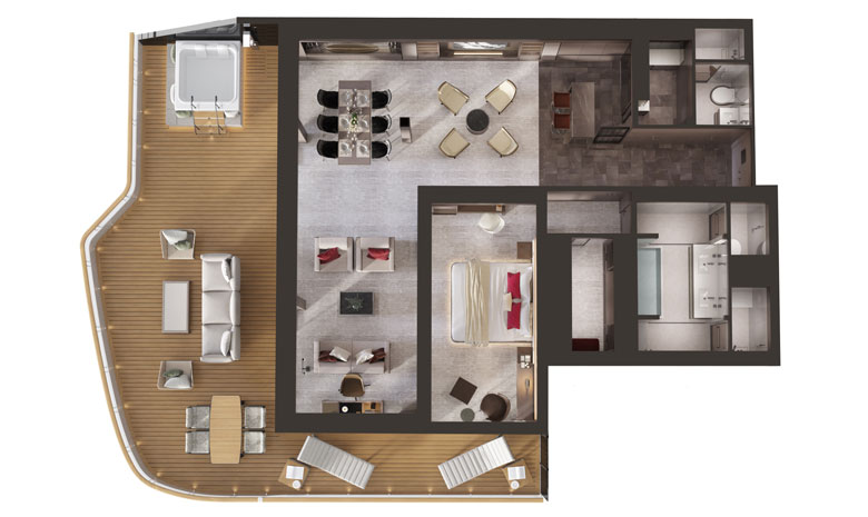 A floor plan of the Owner's Suite. A large wrap around terrace on the left, with plunge pool and deck furniture. Inside there is a living and dining room, bedroom, two large bathrooms, leading to the entrance on the right.