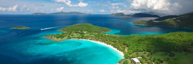 Vibrant blue water lines the white sandy beaches of a lush green island.