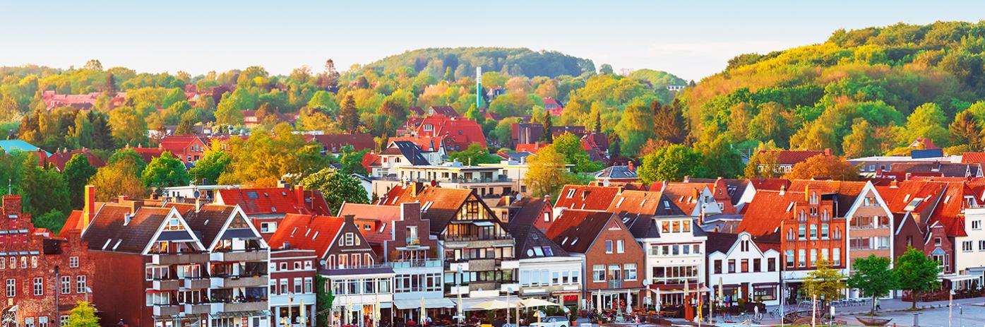 Red houses in front of yellow and green trees line a boat harbor.