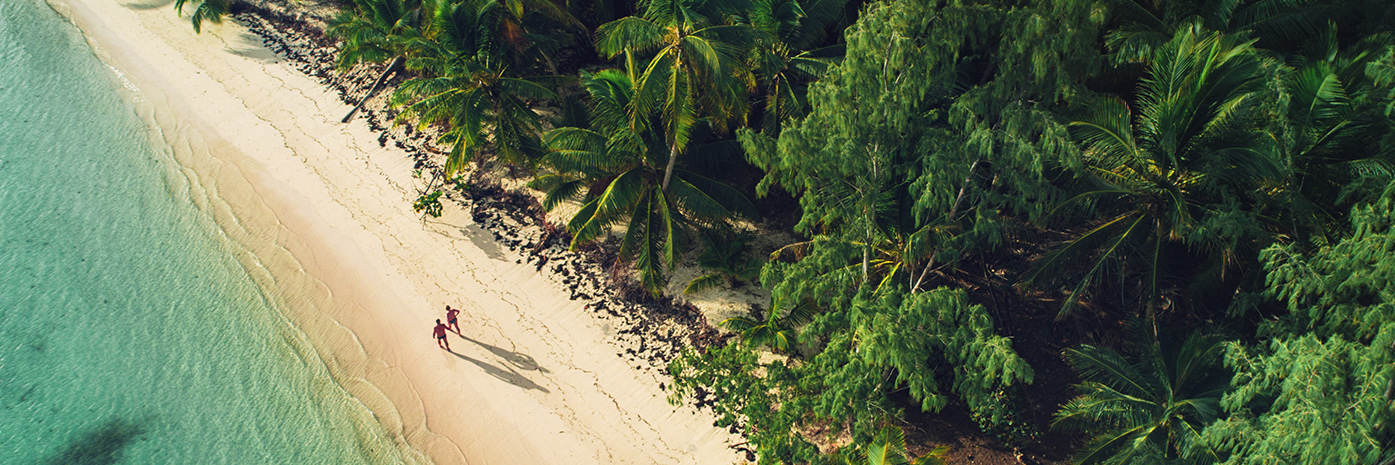 Two people walk down an empty beach, alongside vibrant green palm trees.