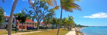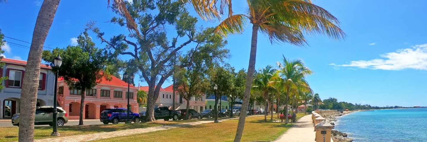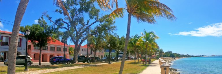 Promenade of Caribbean island along the coast with colorful buildings on a sunny day.