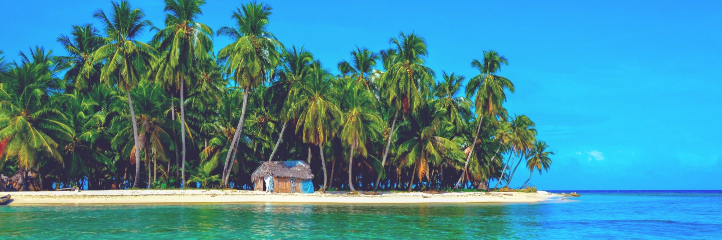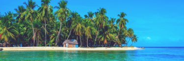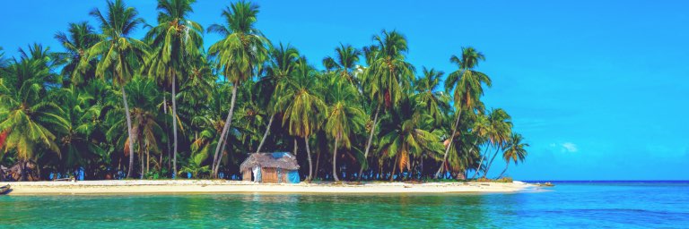 Small tropical island with thatched roof house, white sandy beach and blue waters.