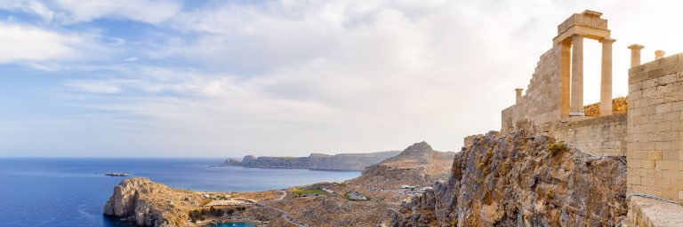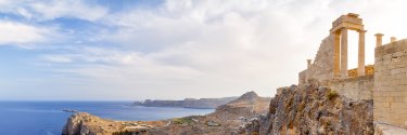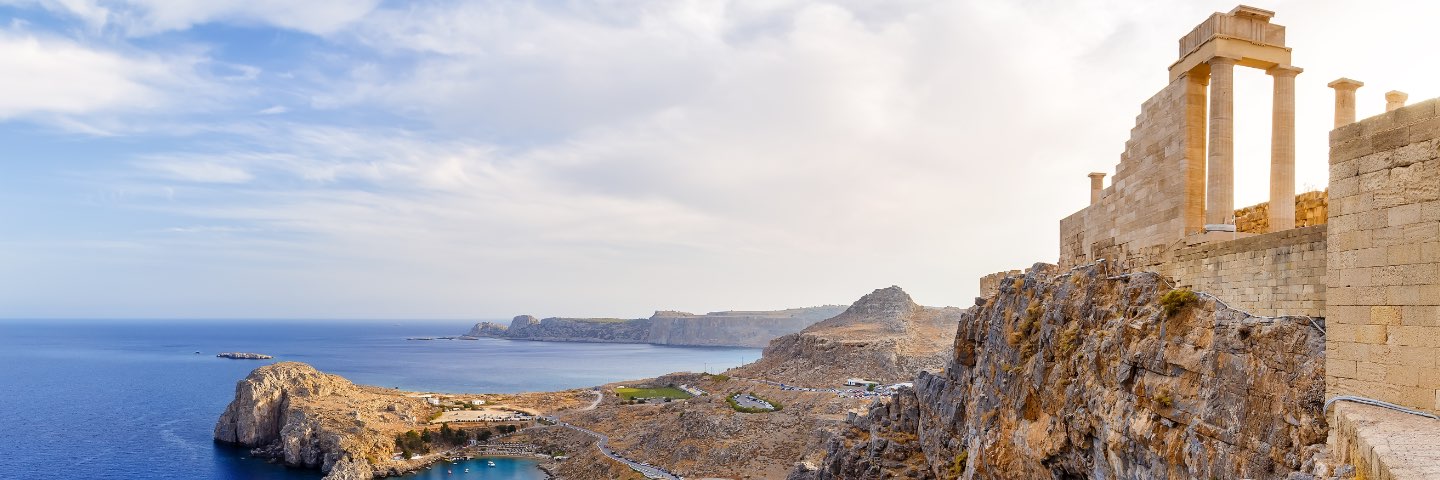 Columns of an ancient temple overlooking Mediterranean bay on a sunny day.