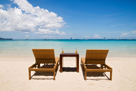 Two wooden beach chairs on sandy beach.