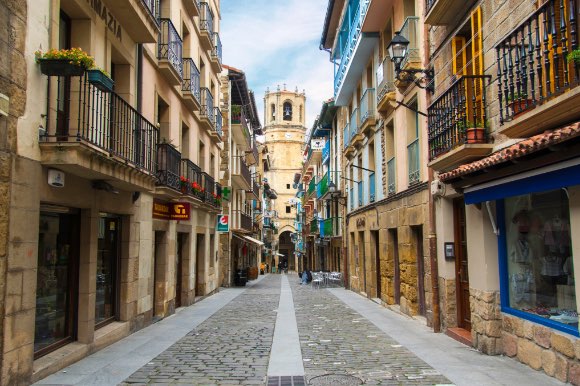 A street with typical two-story buildings of Basque architecture.