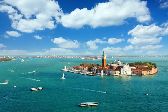 The Venice lagoon sits in blue-green waters and under bright blue skies.