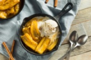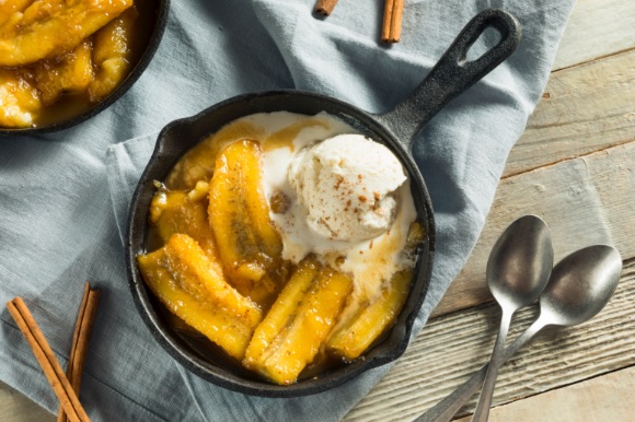 A small cast iron skillet with caramelized bananas and vanilla ice cream.