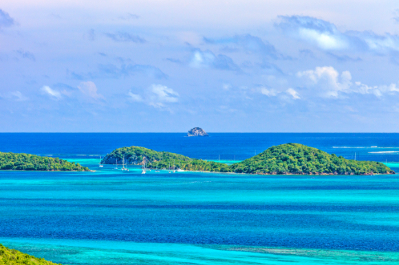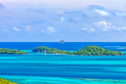 The panorama of a crystal clear sea with small islands full of green in the distance.