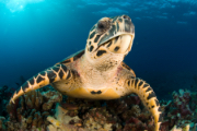 The foreground of a sea turtle swimming in the blue sea.