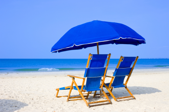 Two deckchairs and a blue umbrella in the middle of a beach.