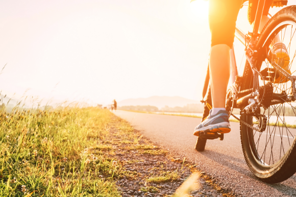 A bicycle on a paved road at sunset.