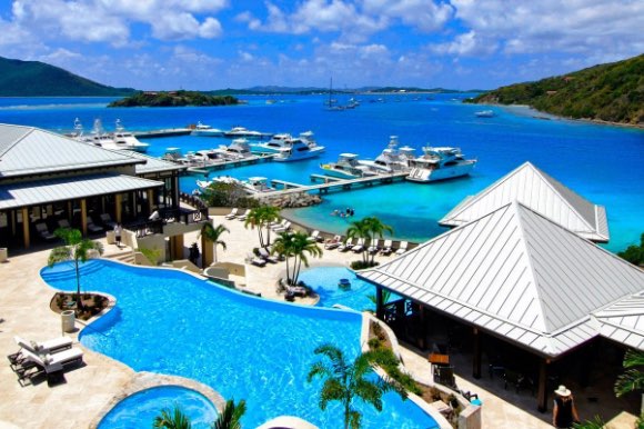 Luxury villas with swimming pools overlooking the sea and the mountains in the distance.
