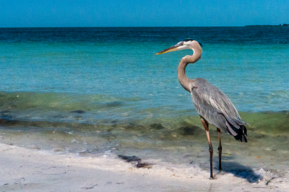 a great heron at the beach with a transparent sea.