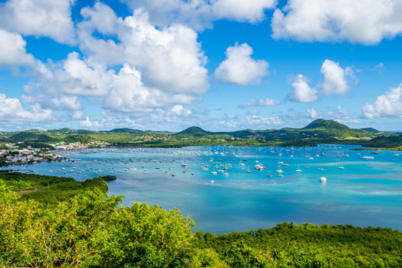The landscape of the sea with some boats surrounded by green hills and mountains.