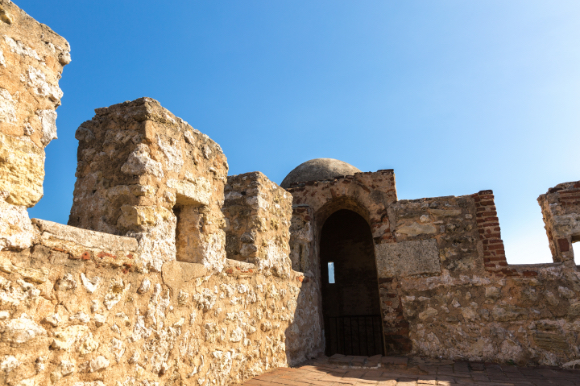 The inside of a corner of a stone castle.