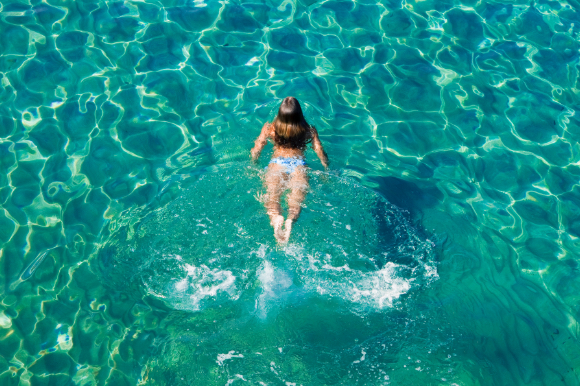 A woman swimming in a crystal clear sea.