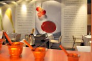 The inside of a restaurant with tables and a bottle of champagne.