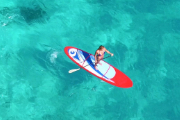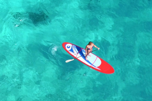 A woman doing sup in a transparent sea.