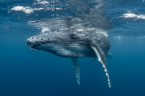 An underwater look at a whale just under the surface.