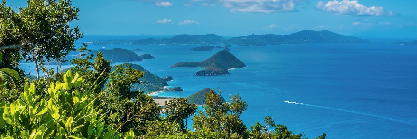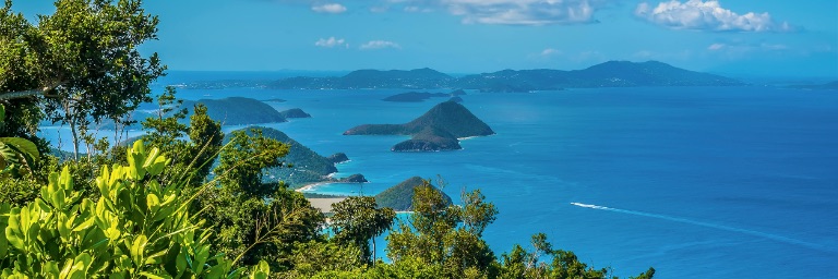 Bright blue water washes up on a white sand beach.