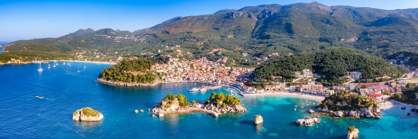 Bright blue water and small islands leading up to the land, covered with greenery and buildings.