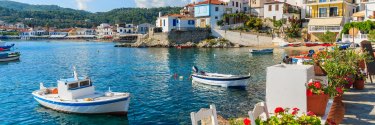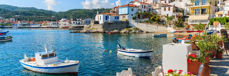 Boats sit anchored in blue water before a seaside town.