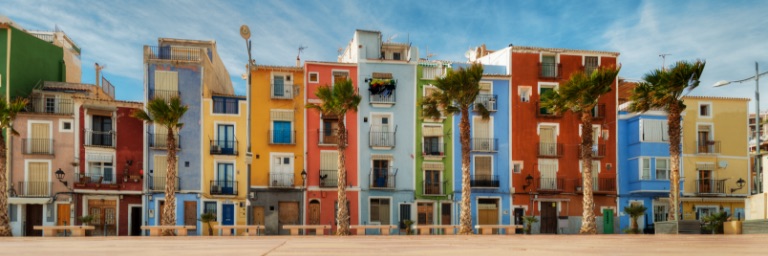 Colorful buildings in a row, behind palm trees.