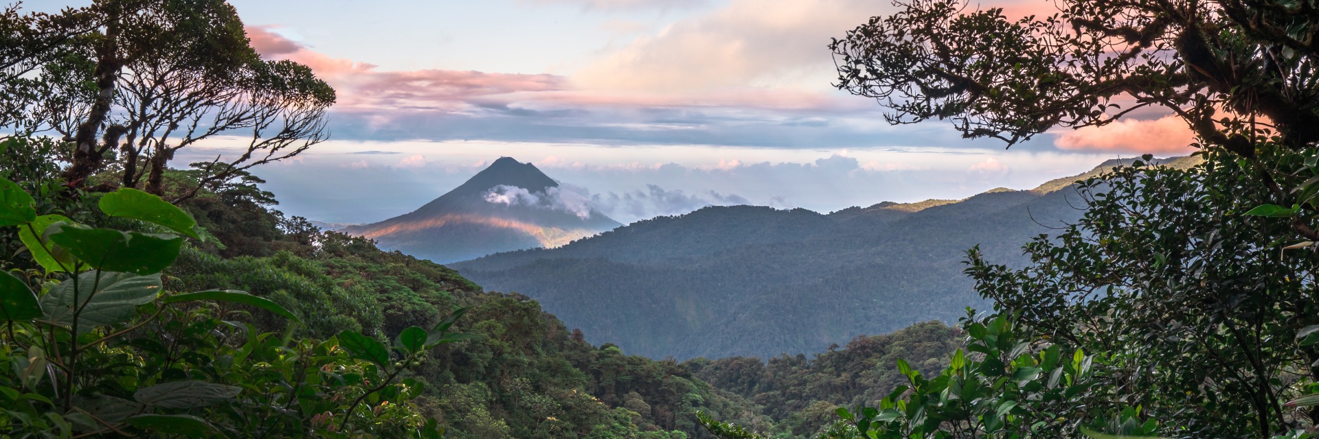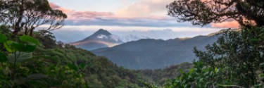 Sun setting over mountains through lush trees and a pink and purple sky.