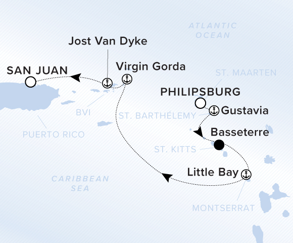 A map of the Caribbean Sea with a line indicating the yacht's journey from Philpsburg to Gustavia to Basseterre to Little Bay to Virgin Gorda to Jost Van Dyke to San Juan.