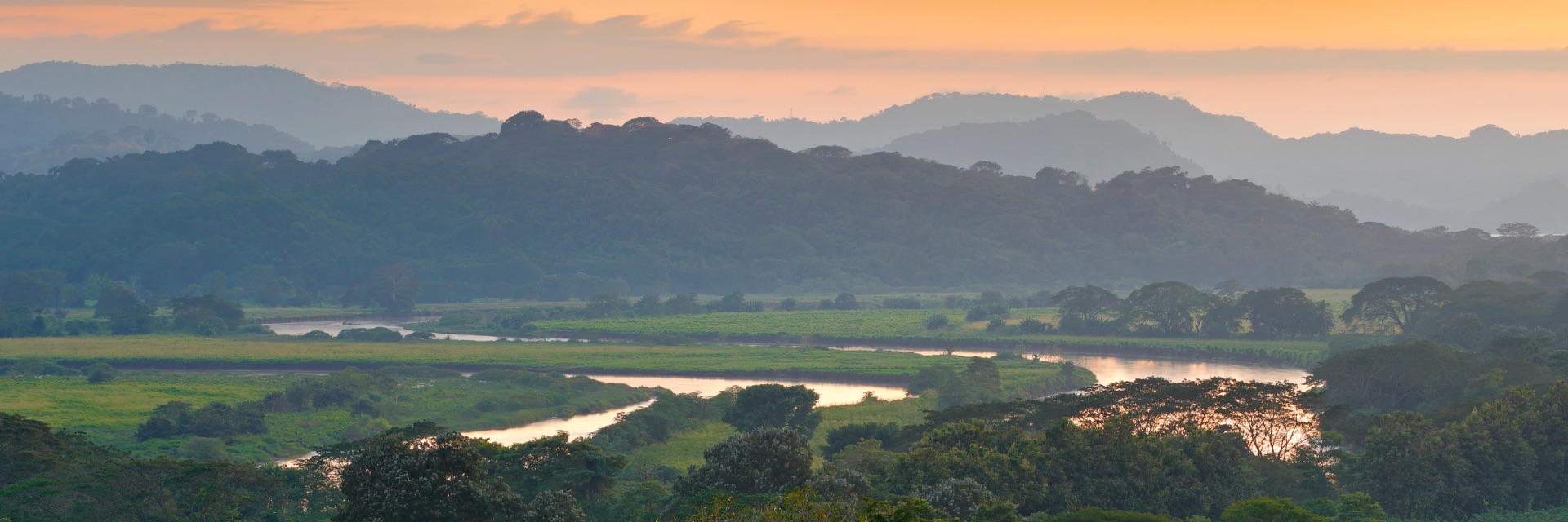 Sun setting over mountains through lush trees and a pink and purple sky.