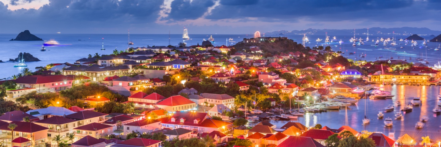 Lights from yachts in the harbor and buildings ashore shine at dusk.