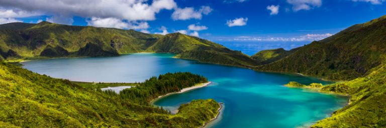 A panoramic view of Lagoa do Fogo, a crater lake in the center of the island of São Miguel in the Azores.
