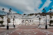 The ancient medina of Tetouan, a town of many buildings with white façades, at the foot of a mountain.