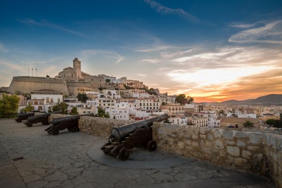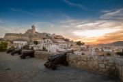 Old cannons positioned in a square overlooking the white buildings of Ibiza at the foot of a fortress.
