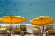 Beach lounge chairs facing the ocean and shaded by a matching yellow umbrellas.