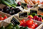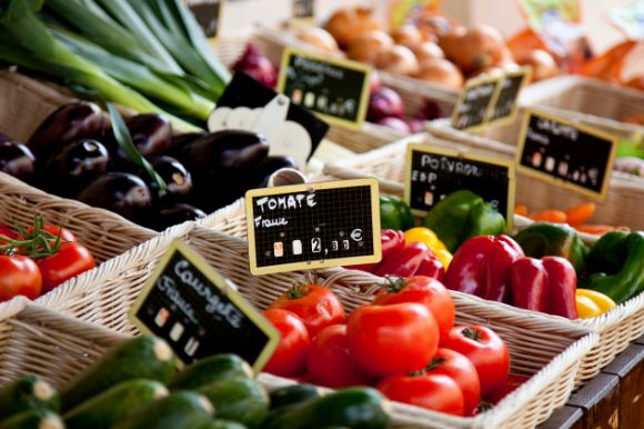 Baskets at a farmers market full of fresh produce like tomatoes, eggplants, bell peppers and more.