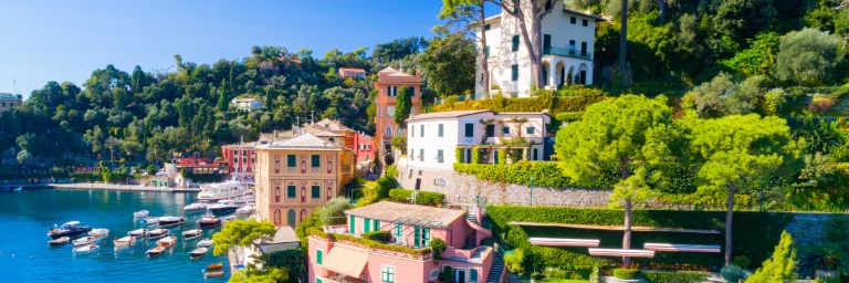 Pastel buildings situated on a green cliffside overlook bright blue water in a harbor.
