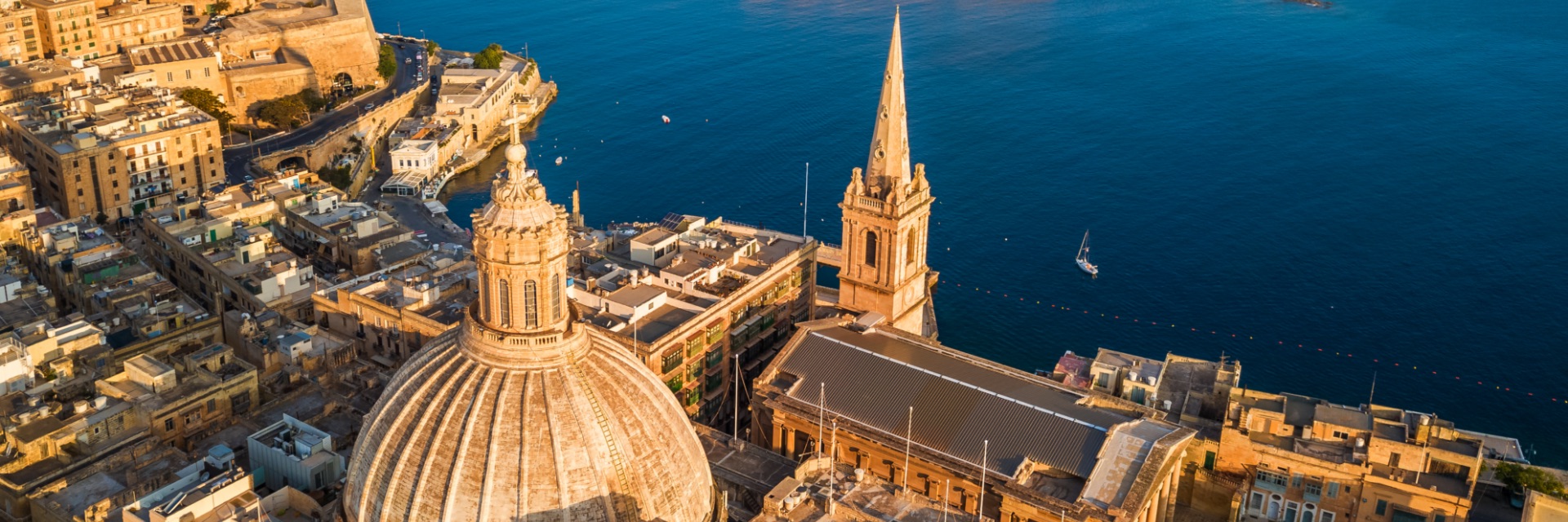The aerial view of a domed building, church tower and town buildings on the coast.