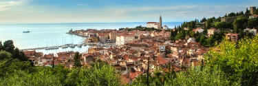 A cluster of terracotta-roofed buildings lining a harbor with many sailboats.