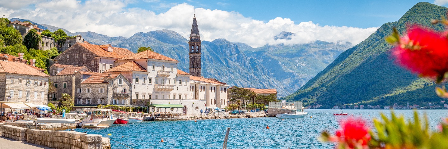 A coastal old town on the edge bright blue waters, surrounded by towering mountains.